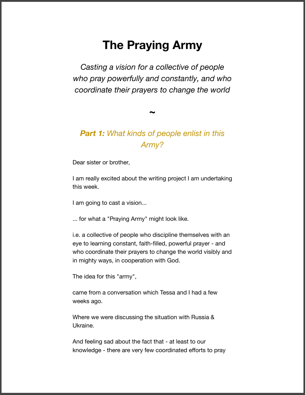 I know "Praying Army" is vague; you'll understand better once you read these emails. And let me just add... some amazing things have been happening within our initial attempt to put these ideas into practice. God is showing up in powerful ways. And while our initial group is currently "closed" to new members... we will "open" again soon for the next round of the experiment.